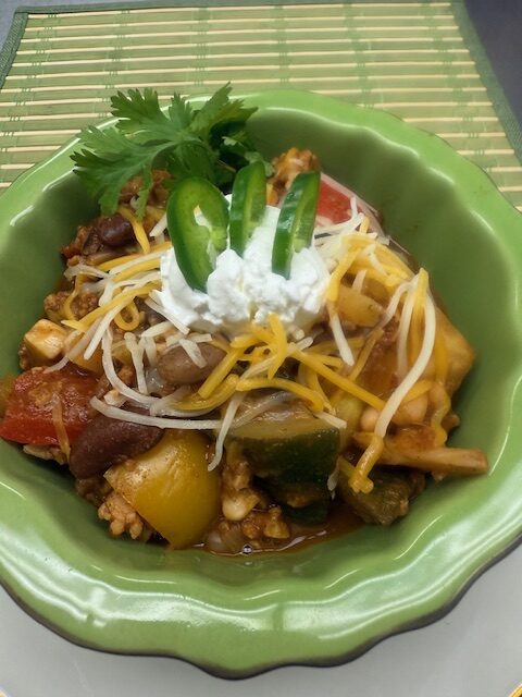 Vegetable Bean & Sweet Potato Chili w’ VT Sour Cream, Mexican Cheeses & Jalapeños